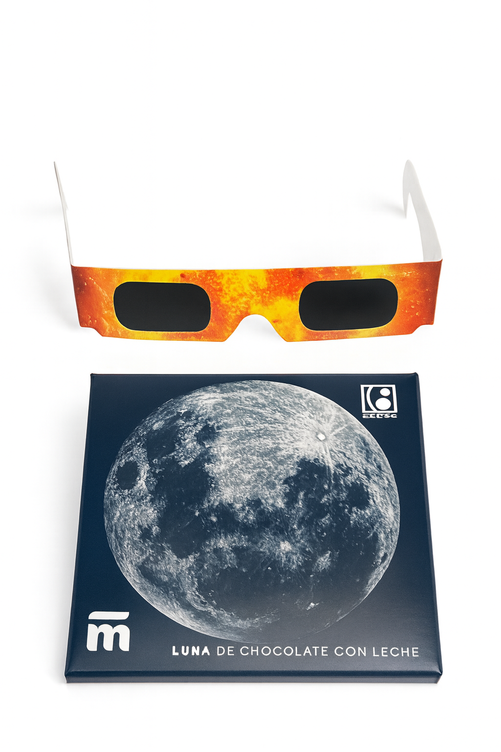 Luna de chocolate con leche y gafas homologadas y certificadas para el eclipse solar